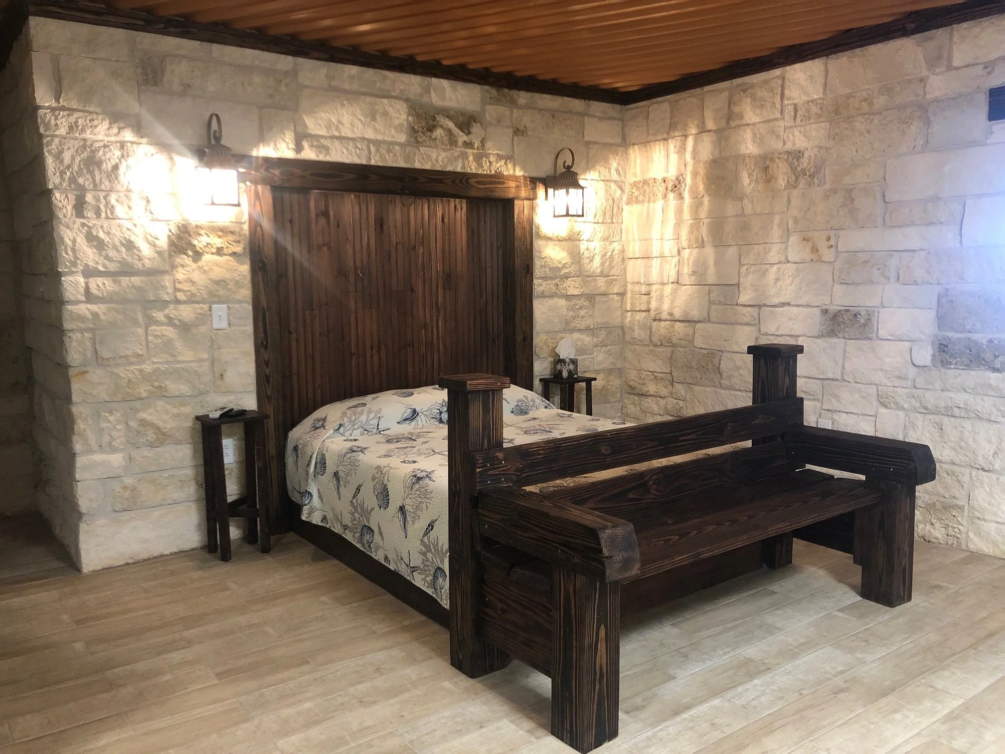 Single Queen Size Bed with Nice Size Bathroom, TV. (Shared Keurig coffee/cold water machine in hallway for use). There are no refrigerators or microwaves in these rooms.